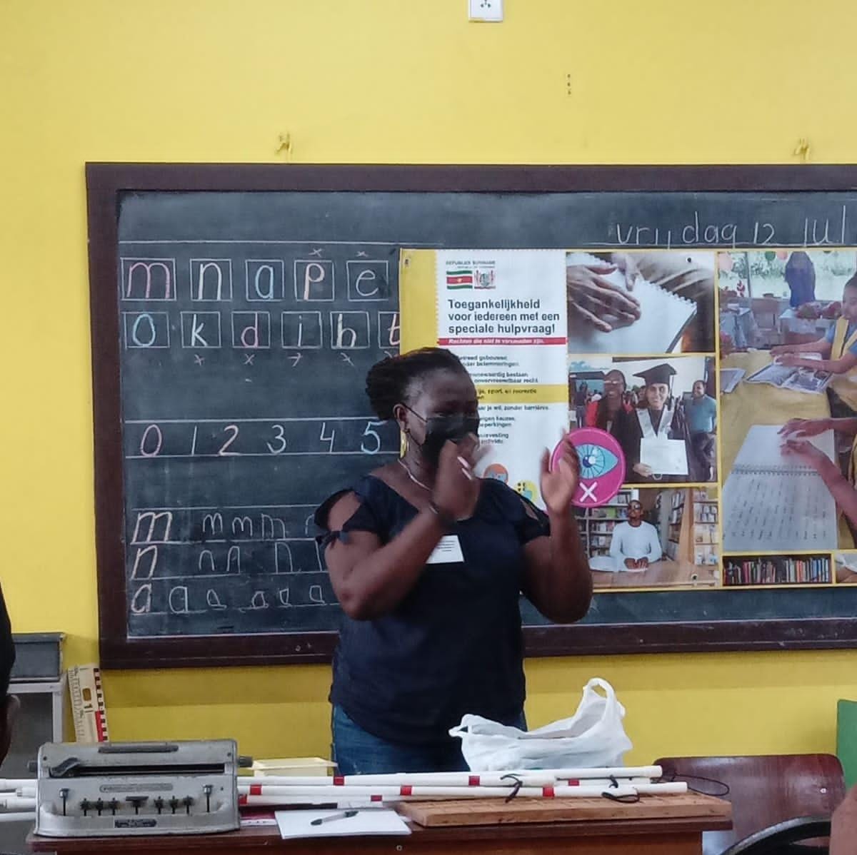 Een ander belangrijk succes was, aldus mevrouw Graskamp. de braille cursus, die nieuwe leerlingen, ouders en begeleiders opleidde uit verschillende districten in het Blindencentrum, te Paramaribo. Deze cursus bood hen essentiële kennis en tools om de samenwerking op school en thuis te verbeteren. Ouders leerden hoe zij hun kinderen kunnen ondersteunen en begeleiden met schoolwerk, wat een significante stap betekende in de sociale integratie van blinde en slechtziende kinderen (op de foto coördinatrice Jeanette Weewee van de braille cursus).