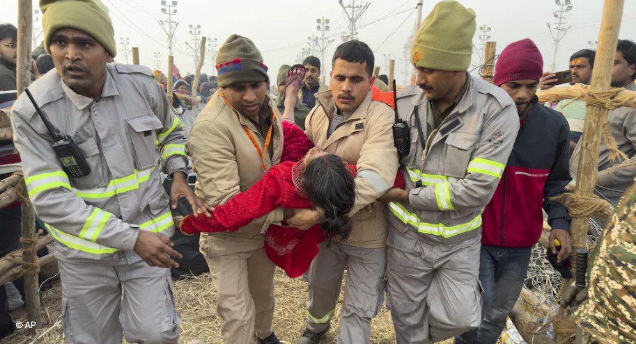 Het Maha Kumbh-festival wordt elke 12 jaar gehouden bij de samenkomst van een aantal heilige rivieren. Er ontstond een stormloop toen mensen zich woensdagochtend haastten om deel te nemen aan een badritueel op het festival.