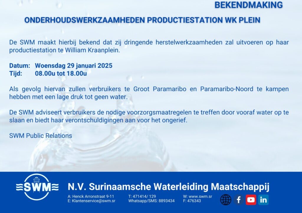 De Surinaamsche Waterleiding Maatschappij, SWM, maakte afgelopen dinsdagochtend via een bekendmaking op social media bekend, dat er woensdag 29 januari onderhoudswerkzaamheden zouden worden uitgevoerd bij het productiestation te William Kraanplein. De werkzaamheden zouden zorgen voor minder waterdruk tot geen water uit kranen van ‘s morgens acht uur tot ‘s middags zes uur.