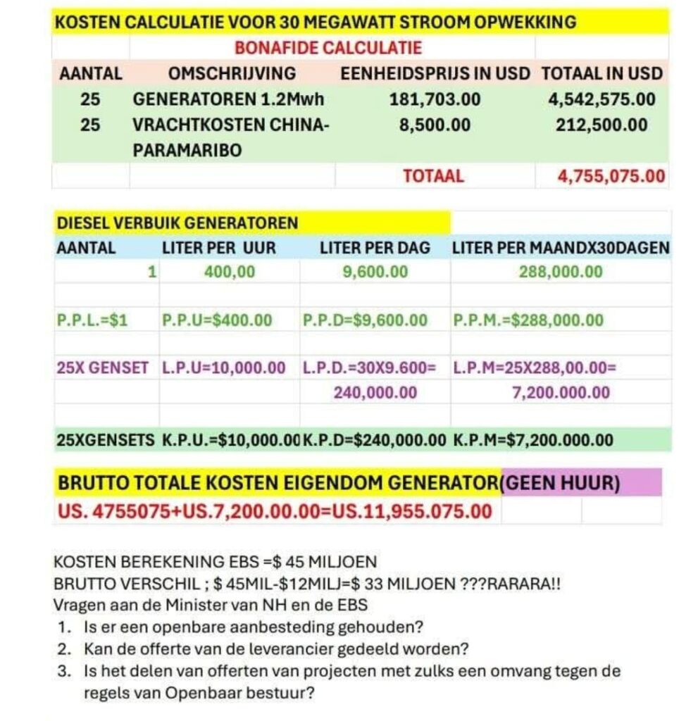 Echter volgens de gegevens die de heer Kuik met het volk heeft gedeeld via social media, blijkt het kopen van generatoren miljoenen goedkoper te zijn dan het huren en daardoor de staat heel veel bespaard. Hij gaat er ook van uit dat we over transparantie spreken indien de offerte van US$ 45 000 geopenbaard wordt aan het volk, en dat men ook meer te weten komt over het speciale bedrijf.