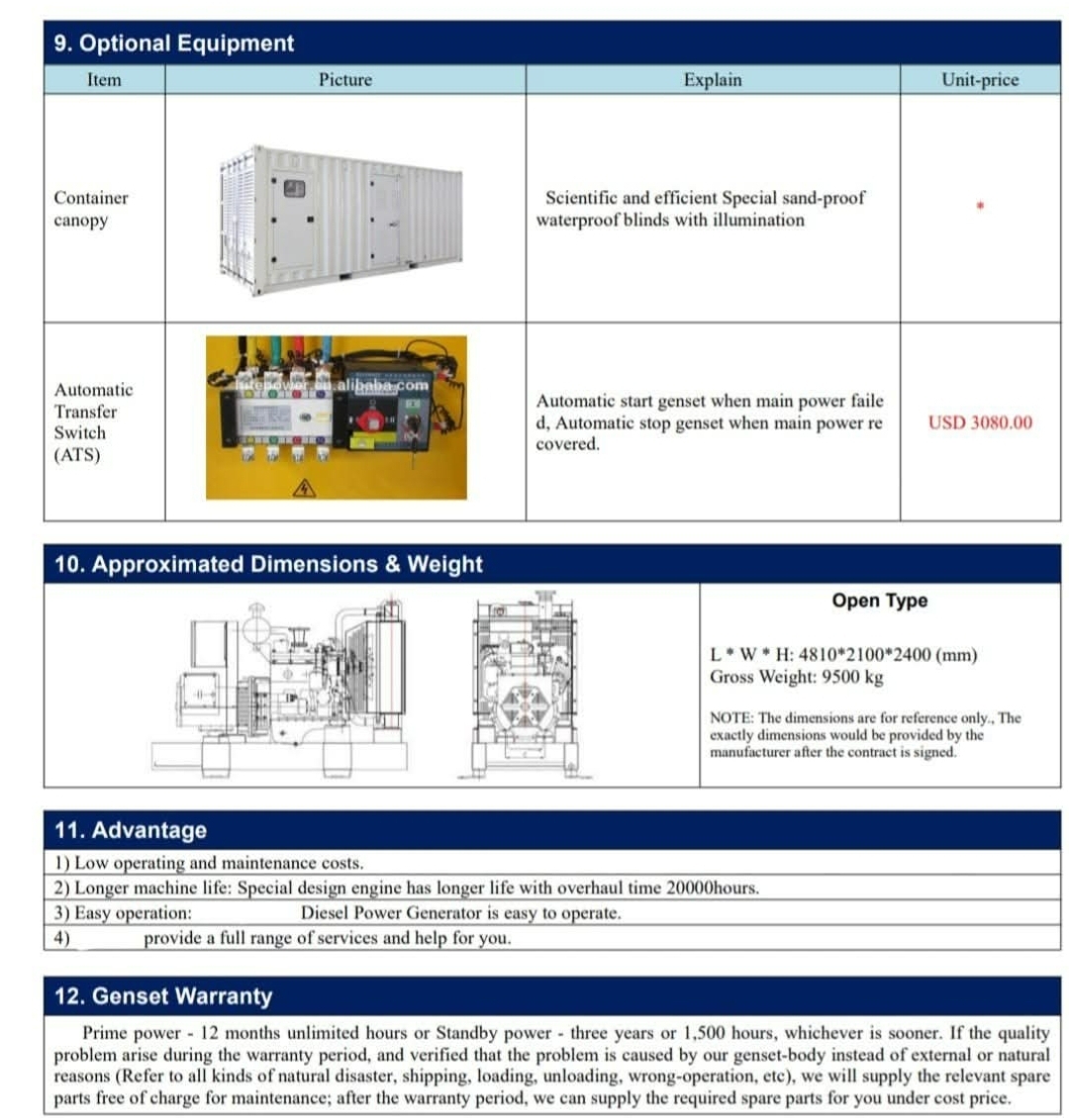 Hierbij zijn bevinding: “De eerste offerte die ik heb ontvangen is een generator van 2 megawatt 200kw diesel voor US$ 307 000 De tweede offerte is voor een generator van 1.2 megawatt, diesel voor een bedrag van US$ 181 703,00 (openframe, zonder gesloten container US$ 162 259,00). Het bedrijf waar deze offertes zijn aangevraagd levert generatoren in meer dan 50 landen, een solide bedrijf, waarmee ik graag om de tafel ga voor de technische beoordeling“.