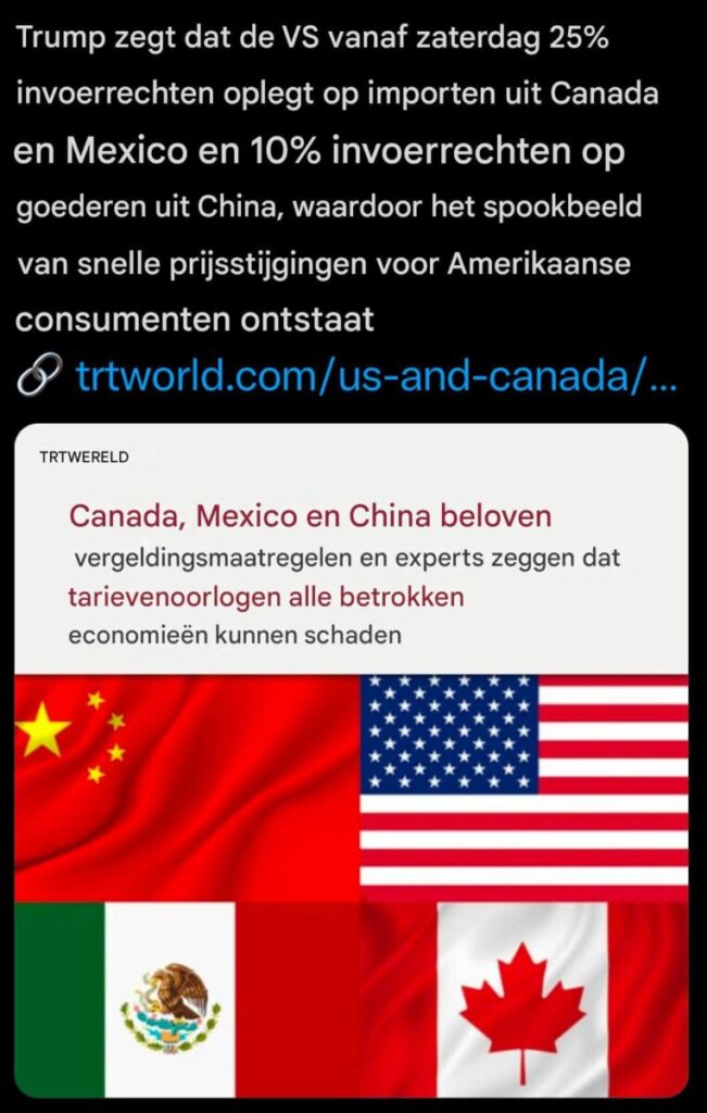 Het Witte Huis zegt dat tarieven voor Canada, Mexico en China vandaag van kracht worden(25 om 10%)