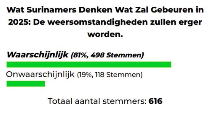 Volgens een recente peiling gefaciliteerd door Dagblad Suriname geloven de meeste Surinamers dat de weersomstandigheden dit jaar zullen verslechteren. Uit de resultaten van de peiling blijkt dat 81% van de deelnemers, wat neerkomt op 498 stemmen, denkt dat het “waarschijnlijk” is dat het weer slechter zal worden. Slechts 19%, oftewel 118 stemmen, acht dit “onwaarschijnlijk”.