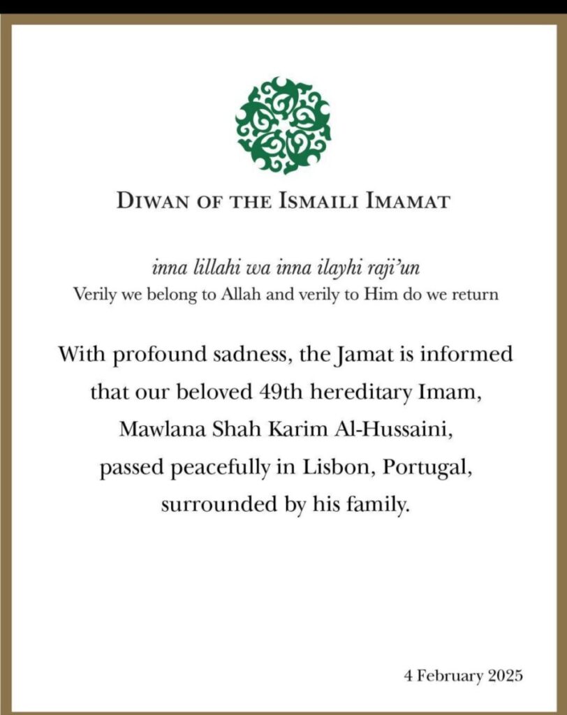 Prins Aga Khan, de 49e erfelijke imam van de Shia Imami Ismaili-moslims, is op 88-jarige leeftijd overleden. Hij werd door zijn volgelingen beschouwd als een directe afstammeling van de profeet Mohammed. De Aga Khan Foundation en de Ismaili-religieuze gemeenschap maakten zijn overlijden bekend op hun websites. Hij stierf dinsdag in Portugal, omringd door zijn familie. Er wordt later een aankondiging verwacht over zijn opvolger. Hij laat drie zonen en een dochter achter.