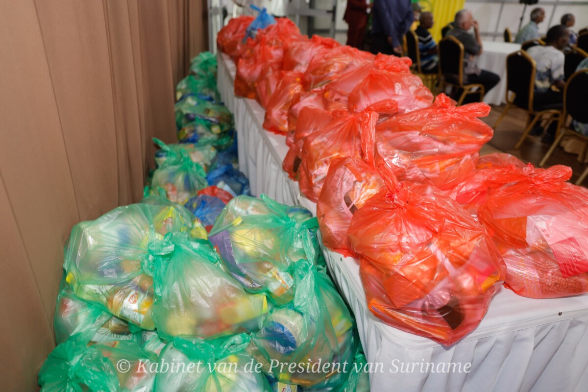 President Chandrikapersad Santokhi heeft in het kader van het Integraal Sociaal Programma (ISP), samen met leden van de Ministerraad en de Indiase ambassadeur Subhash Gupta, maandag 3 februari in de Congreshal voedselpakketten, bestaande uit producten uit India, overhandigd aan burgers die behoren tot de kwetsbare groepen in de samenleving.