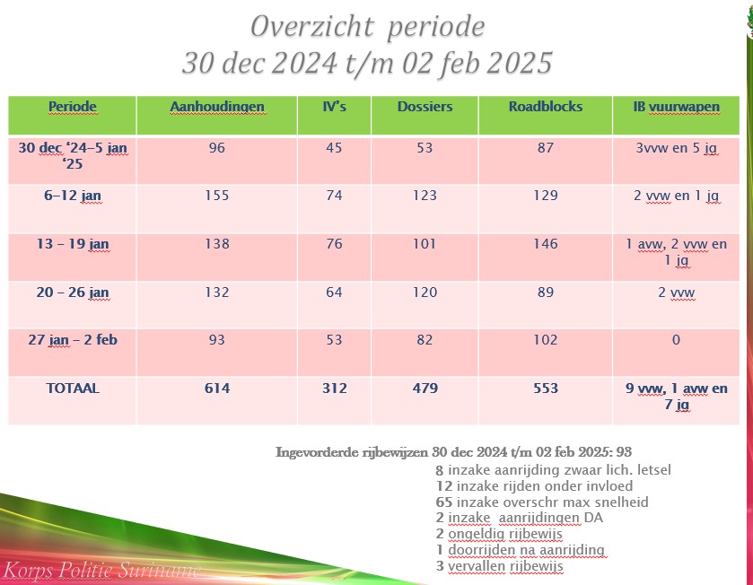 In januari heeft het Korps Politie Suriname (KPS) 614 verdachten landelijk aangehouden. Hiervan is ruim de helft in verzekering gesteld wegens verdenking van uiteenlopende misdrijven waaronder berovingen, overvallen, inbraken en andere grensoverschrijdende misdrijven.