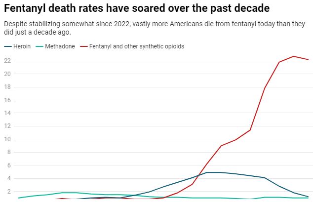 In 2021 stierven meer dan 107.000 Amerikanen aan overdoses – het hoogste aantal ooit geregistreerd – en bijna zeven van de tien sterfgevallen betroffen fentanyl of vergelijkbare synthetische opioïden. In 2022 doodde fentanyl gemiddeld 200 mensen per dag. En hoewel het aantal sterfgevallen door fentanyl in 2023 licht daalde, stierven dat jaar nog steeds bijna 75.000 Amerikanen aan synthetische opioïden. In maart van dat jaar – het meest recente jaar waarvoor volledige jaargegevens over sterfgevallen door overdoses beschikbaar zijn – verklaarde de toenmalige minister van Binnenlandse Veiligheid fentanyl tot ‘de grootste uitdaging waar we als land voor staan’.