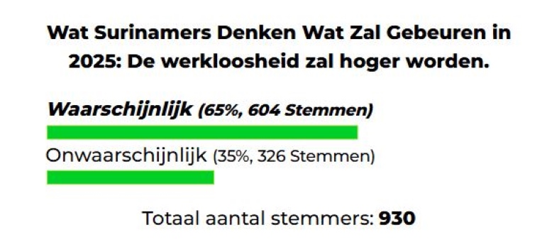 Uit een recente online poll van Dagblad Suriname blijkt dat een meerderheid van de Surinamers verwacht dat de werkloosheid in het jaar 2025 zal stijgen. Van de 930 deelnemers aan de poll gaf 55% (604 stemmen) aan dat zij het waarschijnlijk achten dat de werkloosheid hoger zal worden. De overige 45% (326 stemmen) denkt dat dit onwaarschijnlijk is.