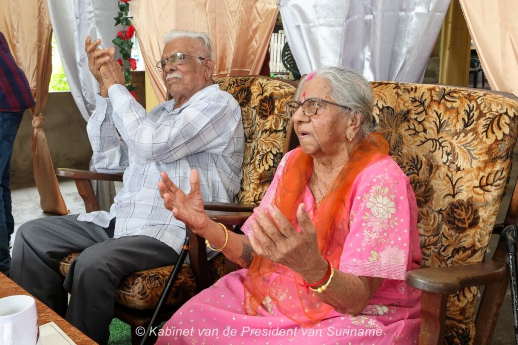 “Het was een bijzonder genoegen om aanwezig te zijn bij het 80-jarig huwelijksjubileum van het echtpaar Gangapersad zaterdag 8 februari in het district Nickerie”, zo laat president Chandrikapersad Santokhi weten via zijn Facebook-pagina.