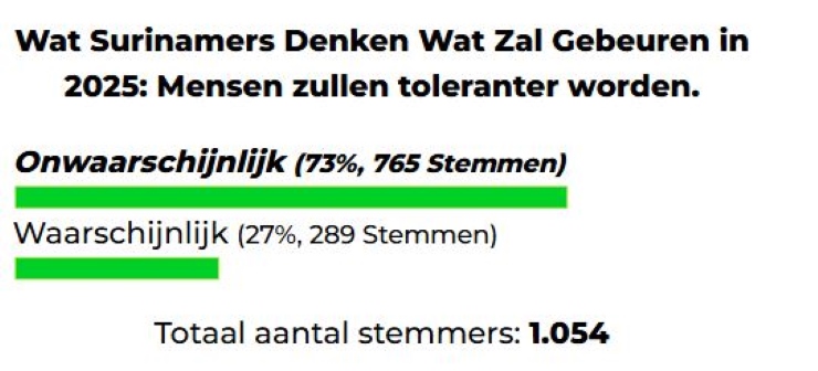 Uit een recente webpeiling van Dagblad Suriname wordt duidelijk, dat 73% van de 1.054 respondenten denkt dat mensen in 2025 niet toleranter zullen worden. Dit komt overeen met 765 stemmen.