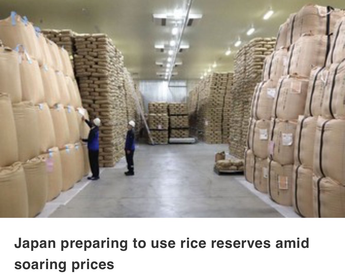 Het is de eerste keer dat de Japanse regering de rijstreserves moet aanspreken vanwege de gestegen prijzen.