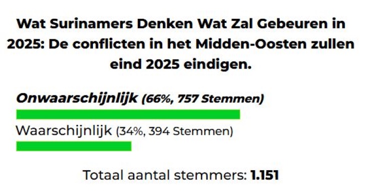 Uit een webpeiling van Dagblad Suriname blijkt dat 66% van de deelnemers (757 stemmen) denkt dat de conflicten in het Midden-Oosten eind 2025 niet zullen zijn opgelost.