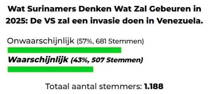 Uit een recente online poll van Dagblad Suriname blijkt dat 57% van de deelnemers (681 stemmen) een invasie van de Verenigde Staten (VS) in Venezuela in 2025 onwaarschijnlijk vindt.