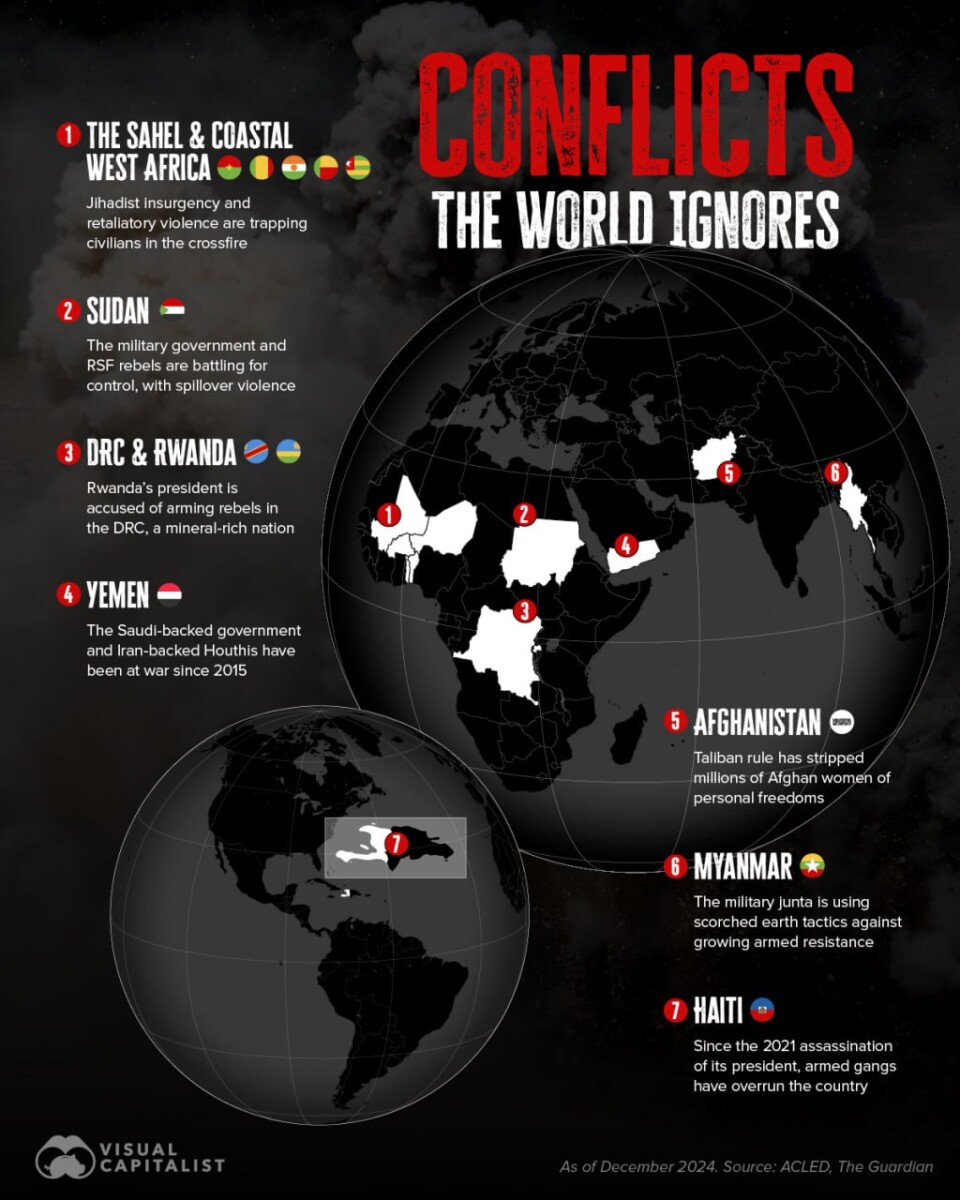 Jihadistische opstanden in West-Afrika, geleid door JNIM en IS Sahel, intensiveren met drones en IED’s, waarbij burgers worden geschaad. In Centraal-Afrika beschuldigt men Rwanda van het bewapenen van M23-rebellen in de DRC. Soedan ziet gevechten tussen het leger en RSF-rebellen, terwijl Myanmar’s junta een verschroeide aarde-tactiek hanteert. In Afghanistan ontneemt de Taliban vrouwenrechten, en in Jemen woedt sinds 2015 een oorlog tussen de regering en Houthi’s.