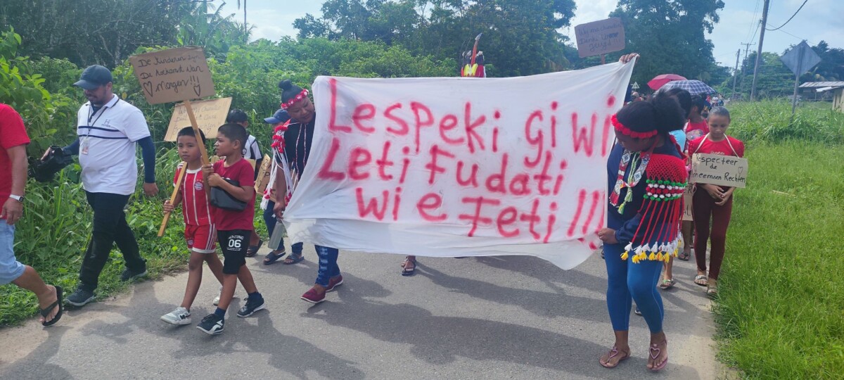 De demonstranten begonnen bij Washabo centrum en lopen naar Section, Apoera, Sandlanding en Apoera Haven, dat het eindpunt is van de protestloop.