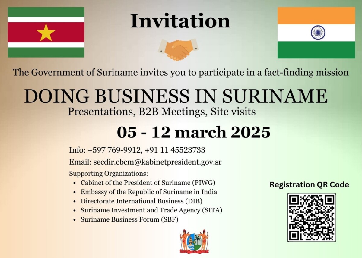 Een Indiase ondernemersdelegatie brengt van 5 tot 12 maart een fact-finding missie naar Suriname om samenwerking te verkennen in sectoren zoals landbouw, infrastructuur, gezondheid en olie.