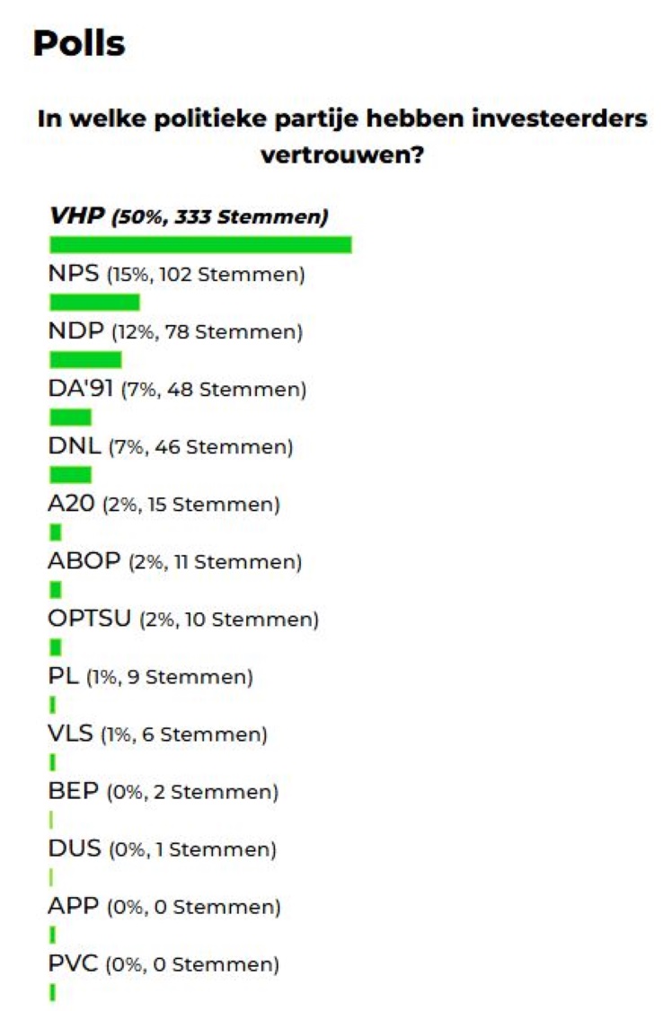 Uit een recente webpeiling van Dagblad Suriname blijkt dat de VHP (Vooruitstrevende Hervormingspartij) het meeste vertrouwen geniet onder investeerders. Met 50% van de stemmen (333 stemmen) voert de VHP de lijst aan. De NPS (Nationale Partij Suriname) volgt met 15% (102 stemmen), terwijl de NDP (Nationale Democratische Partij) op de derde plaats staat met 12% (78 stemmen).