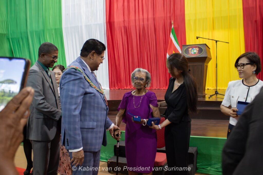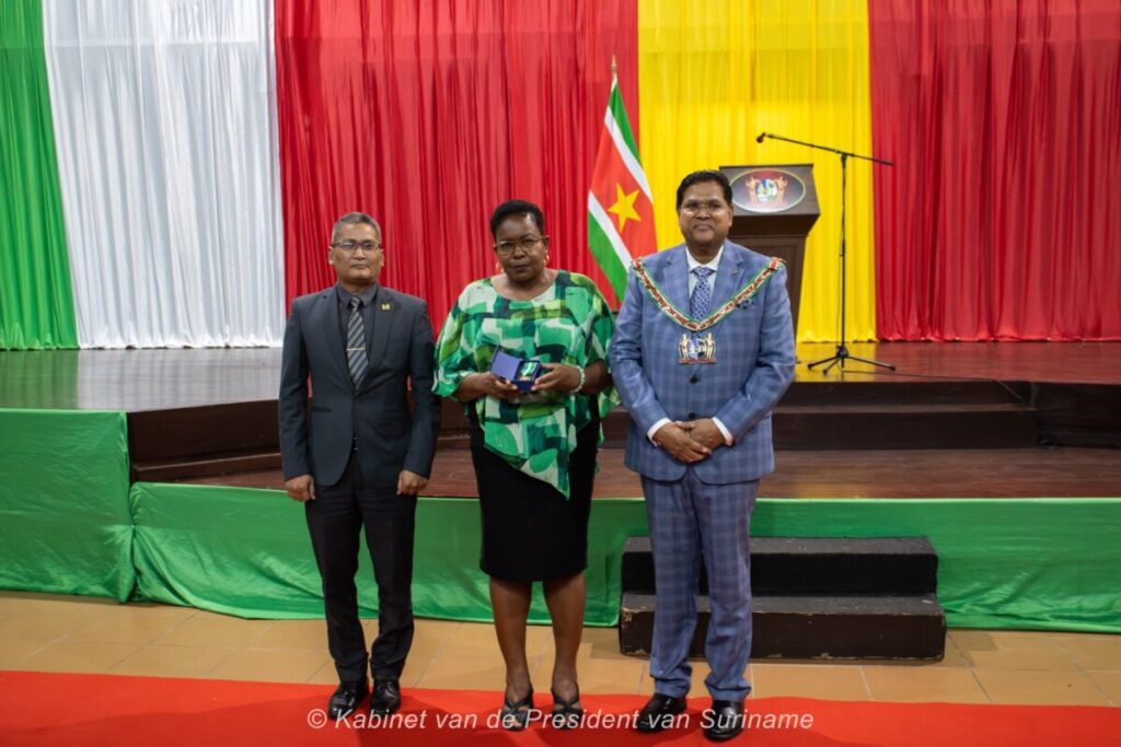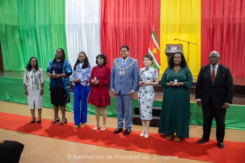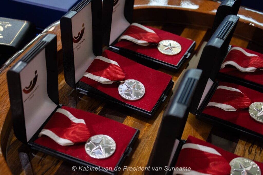President Chandrikapersad Santokhi, first lady Mellisa Santokhi-Seenacherry, ministers en Jack Uden, voorzitter van de decoratiecommissie, hebben in de Congreshal vrouwen geëerd met eremedailles en certificaten ter gelegenheid van de internationale Dag van de Vrouw vandaag, zaterdag 8 maart.