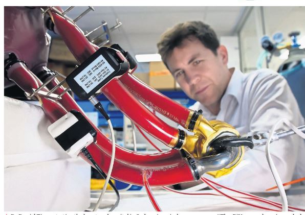 ▲ Dr. Daniel Timms test de door hem uitgevonden hartpomp die, naar men hoopt, uiteindelijk menselijke transplantaties zou kunnen vervangen. FOTO: BIVACOR