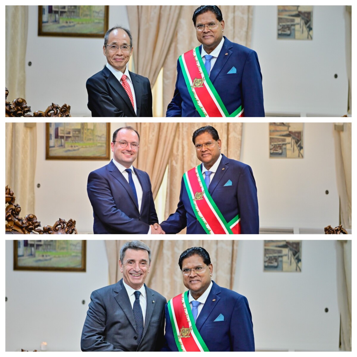 Drie niet-residerende ambassadeurs hebben dinsdag 18 maart hun geloofsbrieven aangeboden aan president Chandrikapersad Santokhi. De ceremonie in het presidentieel paleis versterkt de diplomatieke banden van Suriname met Hongarije, Japan en Italië. Minister Albert Ramdin van Buitenlandse Zaken, International Business en Internationale Samenwerking was hierbij aanwezig.