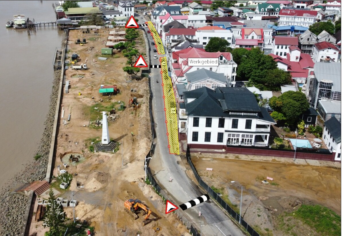 Het is inmiddels enkele maanden ook niet meer mogelijk om te parkeren langs de Waterkant van Paramaribo. Dit vanwege de werkzaamheden die op dat deel van de weg zullen worden verricht. Er wordt een rijstrook vrij gehouden voor het doorgaand verkeer, maar die bevindt zich in deplorabele staat. Rondom het oude vlaggenplein zijn ook bouwschuttingen geplaatst.