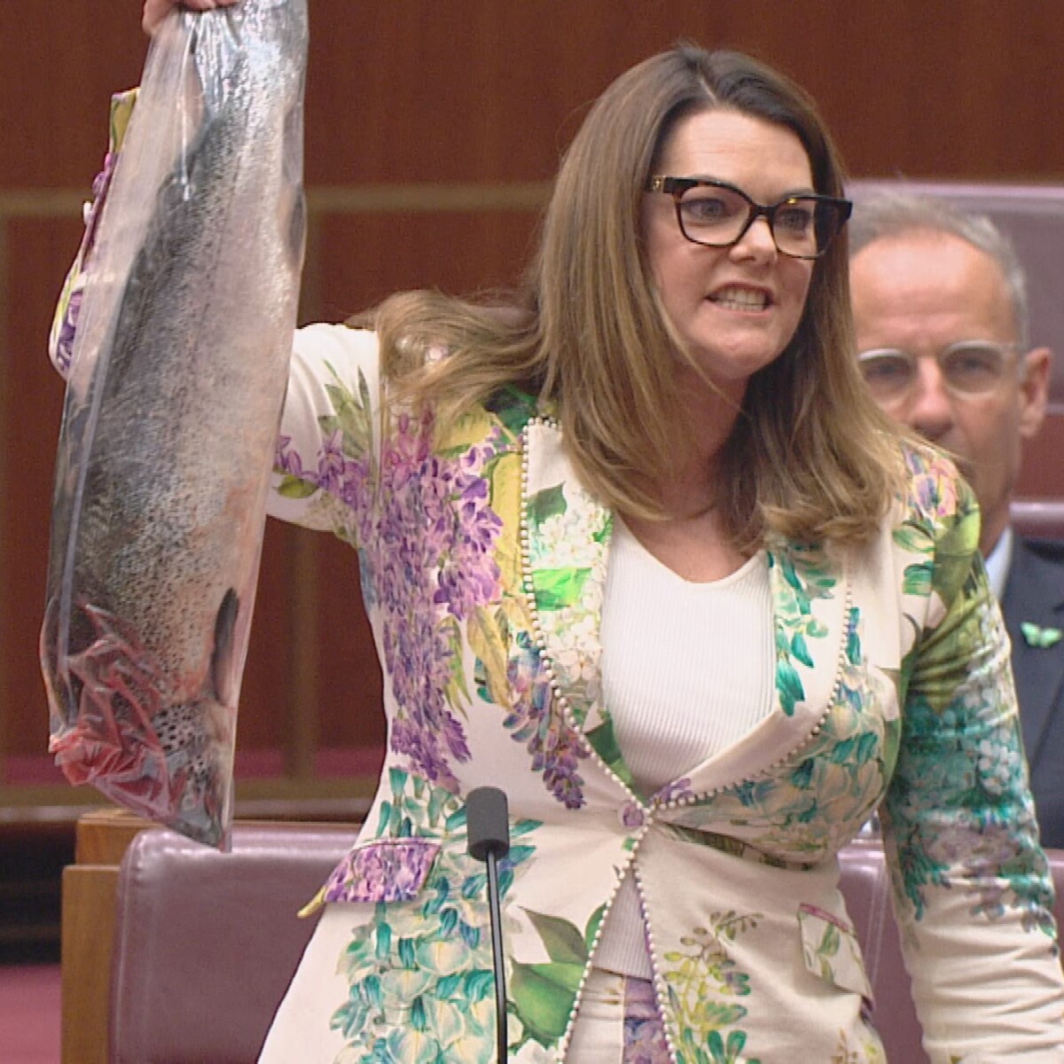 Ze haalde een hele dode zalm tevoorschijn in een plastic zak terwijl ze aan Labor-senator Jenny McAllister, die de minister van Milieu vertegenwoordigde, vroeg: “Hebt u aan de vooravond van de verkiezingen uw milieu-erkenningen verkocht voor een rotte, stinkende uitgestorven zalm?”