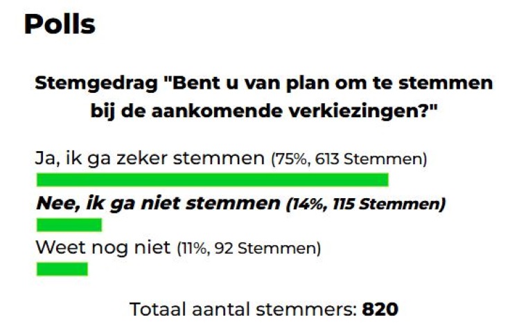 Maar liefst 75% (613 stemmen) gaf aan zeker te gaan stemmen, terwijl 14% (115 stemmen) aangaf niet te zullen deelnemen. Een kleine groep, 11% (92 stemmen), twijfelt nog over hun stemgedrag.