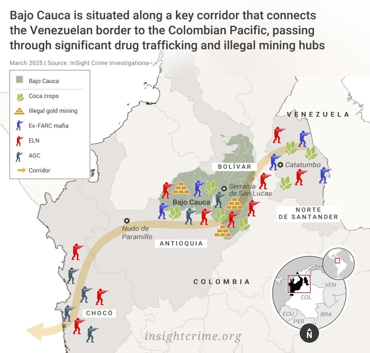 Bajo Cauca herbergt meer dan 8.000 hectare cocagewassen en enorme goudreserves. In 2024 werd hier 11,64 ton goud gedolven, goed voor 54% van Antioquia’s productie. Straatgroepen profiteren van mijnbouw door extortie en vaste kosten te innen. Daarnaast is het gebied een cruciale corridor voor drugstransport.