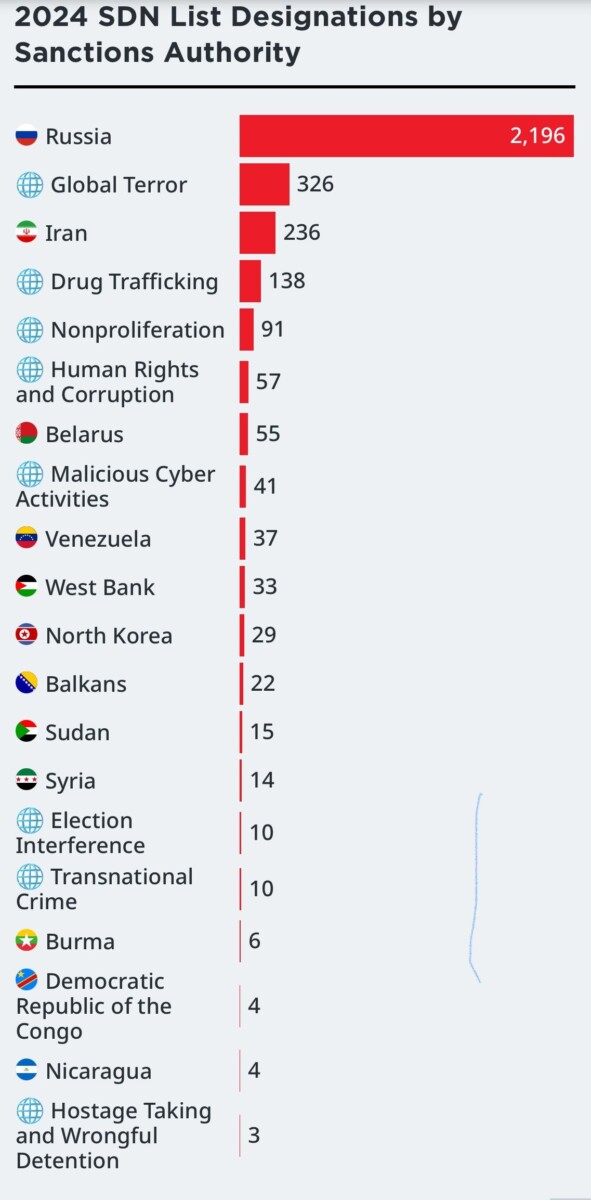 De Verenigde Staten hebben hun gebruik van economische sancties en exportcontroles aanzienlijk uitgebreid als reactie op wereldwijde geopolitieke spanningen, zoals Ruslands invasie van Oekraïne, strategische concurrentie met China en onrust in het Midden-Oosten. Het Office of Foreign Assets Control (OFAC) voegde 3.135 personen en entiteiten toe aan de Specially Designated Nationals and Blocked Persons (SDN)-lijst – een stijging van 25% vergeleken met 2023.