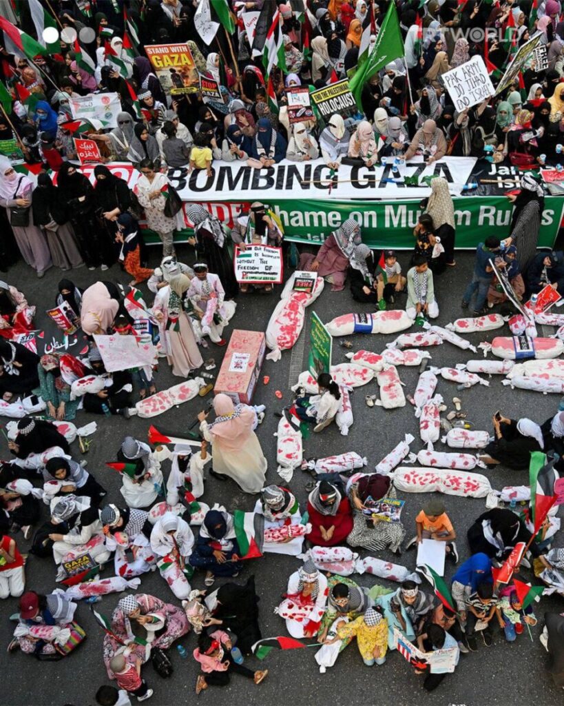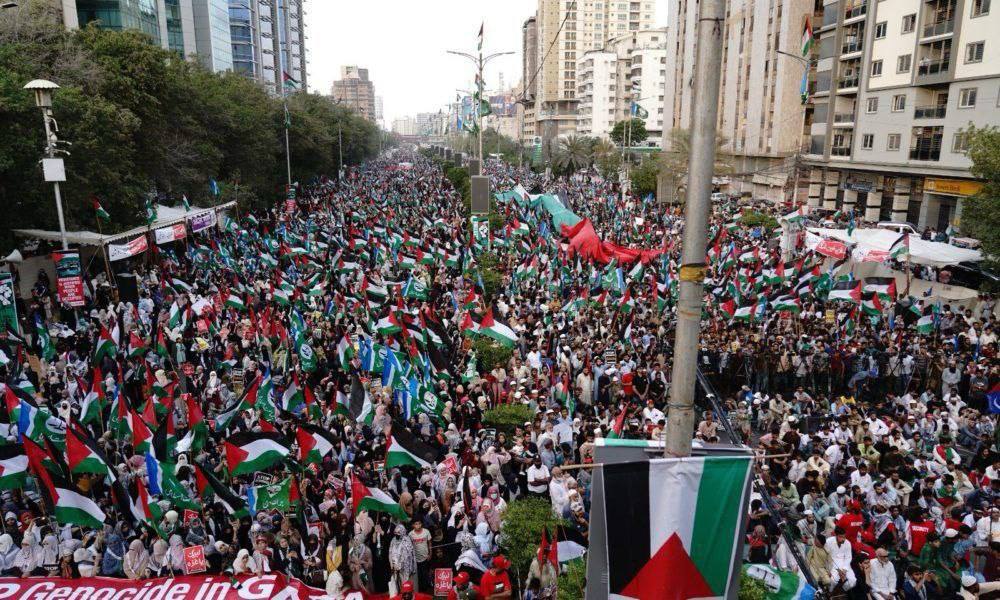 Tienduizenden mensen demonstreren in Karachi om de Palestijnen te steunen en veroordelen daarmee de ruim een ​​jaar durende, door de VS gefinancierde Israëlische genocide in Gaza.