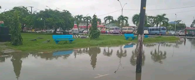 Na een lange nacht vol hevige regenval staat ook het gebied rond de Centrale Markt in Nieuw Nickerie plaatselijk blank. De wateroverlast komt op een ongelegen moment: het district maakt zich juist op voor een druk en feestelijk Paasweekend met tientallen geplande activiteiten rondom hetzelfde marktgebied.