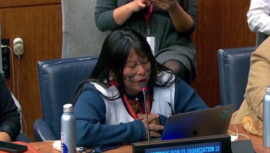 Tijdens de tweede sessie van het Permanente Forum voor Inheemse Zaken van de Verenigde Naties (VN), gehouden op maandag 21 april in New York, hield de inheemse leidster Alessandra Korap Munduruku een toespraak waarin ze de aanwezigheid van bedrijven, banken en illegale activiteiten op het grondgebied van het Munduruku-volk in de Braziliaanse deelstaat Pará aan de kaak stelde.