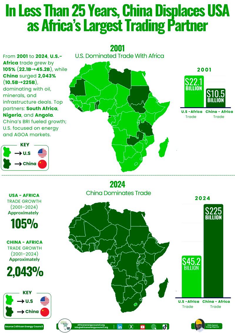 In minder dan 25 jaar is de handelsdynamiek in Afrika radicaal veranderd. Waar de VS in 2001 nog de grootste handelspartner was (22,1miljard),heeftChinaeenspectaculairegroeidoorgemaakt(+204322,1miljard),heeftChinaeenspectaculairegroeidoorgemaakt(+2043225 miljard in 2024.