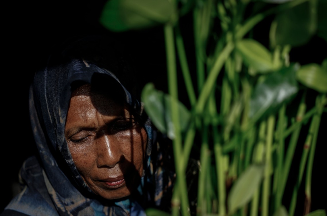 Ze laat zich zakken in het blauwgrijze water, dat soms tot haar borst reikt. “Ik besefte dat ik, toen het water begon te stijgen, mangrovebomen moest planten, zodat ze zich konden verspreiden en het huis konden beschermen tegen de wind en de golven.” (Foto: REUTERS/Ajeng Dinar Ulfiana)