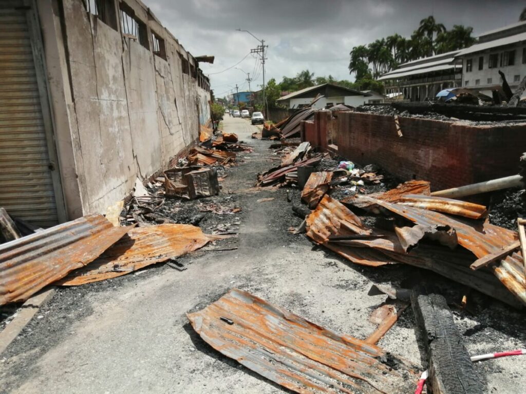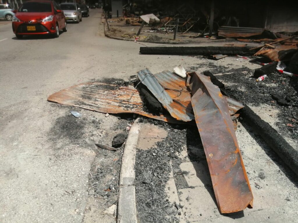 Na de grote brand aan de Henck Arronstraat van 17 april kunnen voetgangers nog altijd niet geheel vrij hun weg vervolgen over het trottoir. Nog steeds liggen de door de hitte verwrongen zinkplaten gekruld op de weg. Wie niet oplet snijdt zich aan deze stille getuigen van de vreselijke brand. Enkele zinkplaten liggen zelfs nog gedeeltelijk op het wegdek waar het verkeer rijdt. Dit is niet bevorderlijk voor de verkeersveiligheid.