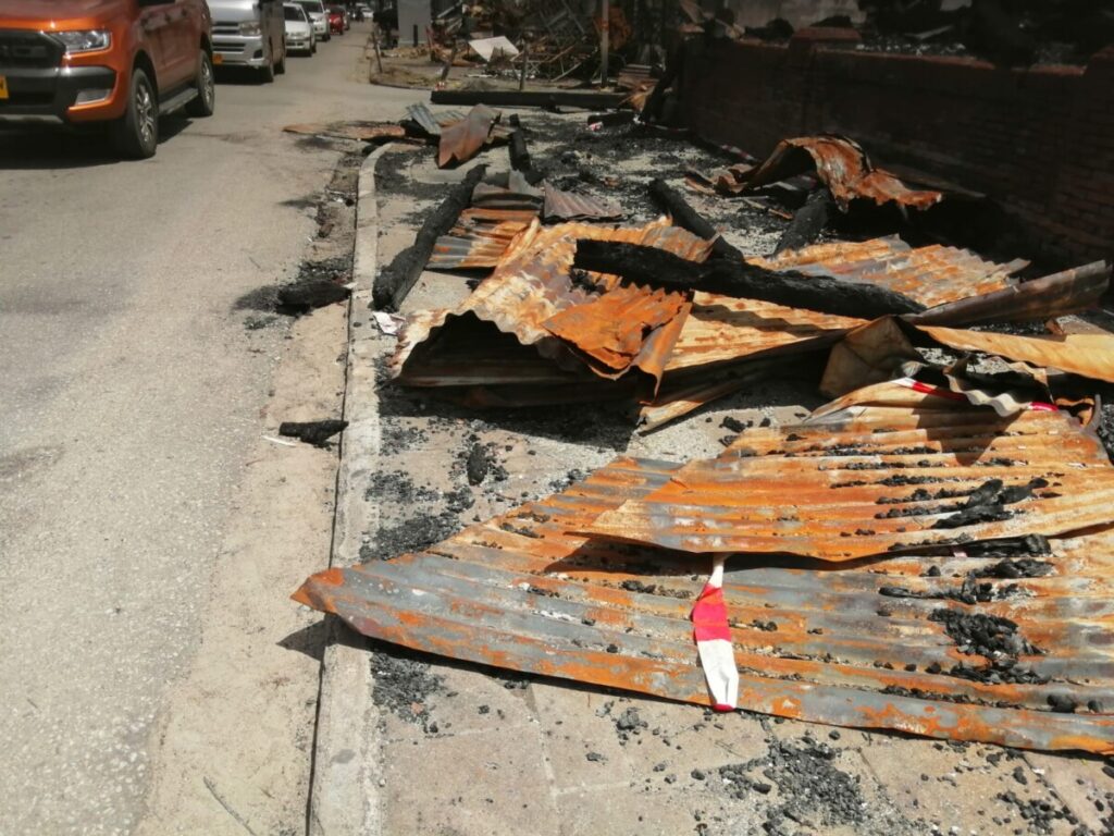 Zonder zinkplaten op de weg is het verkeer al onveilig genoeg. Helemaal opvallend is dat een zijstraat van de Henck Arronstraat, waarvan het naambord ook door de vlammen is verwoest, bezaaid is met de resten van de brand. Hier komt geen auto voorbij. Voetgangers en bromfietsers gaan de straat nog wel in, met alle risico’s van dien. Ook hier kan de vraag gesteld worden of dit veilig is.