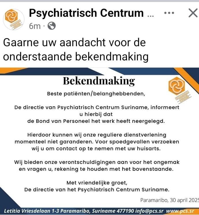 De situatie binnen het Psychiatrisch Centrum Suriname (PCS) blijft zorgwekkend, vooral voor de medewerkers die geconfronteerd worden met vertraging in de uitbetaling van de salarissen. Het centrum heeft woensdag 30 april een verklaring uitgegeven (zie onderaan) dat de âBond van Personeelâ het werk heeft neergelegd. De uitbetaling van de salarissen voor april is vertraagd.Â