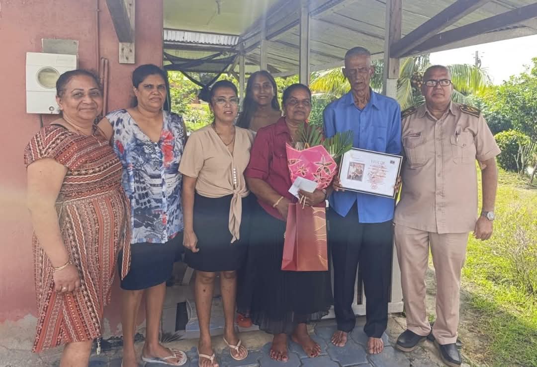 De ressortleider van de oostelijke polders in Nickerie heeft vrijdag 2 mei het echtpaar Makhaisingh-Toewar gehuldigd in verband met hun diamanten huwelijk (60 jaar getrouwd).