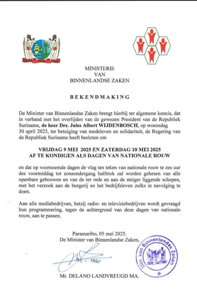 De Surinaamse regering heeft vrijdag 9 mei en zaterdag 10 mei uitgeroepen tot dagen van nationale rouw vanwege het overlijden van oud-president drs. Jules Albert Wijdenbosch op 30 april.