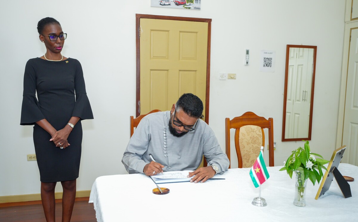 President Dr. Irfaan Ali van Guyana heeft vrijdag zijn medeleven betuigd met het volk van Suriname door het rouwregister te tekenen voor de overleden oud-president van Suriname, Jules Albert Wijdenbosch. De plechtigheid vond plaats in de ambassade van Suriname in Georgetown.