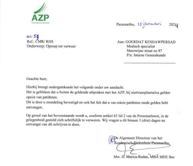Minister Amar Ramadhin van Volksgezondheid in Suriname heeft scherpe kritiek geuit op internist-nefroloog Subhash Goerdat, tevens DNA-kandidaat voor de ABOP. De minister beschuldigt Goerdat ervan enkele jaren geleden geld te hebben aangenomen voor het screenen van patiënten voor niertransplantaties.