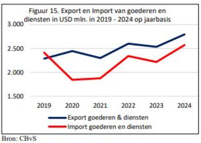 De totale export van goederen en diensten van Suriname in 2024 bedroeg USD 2,8 miljard. Daarentegen bedroeg de totale import USD 2,6 miljard.