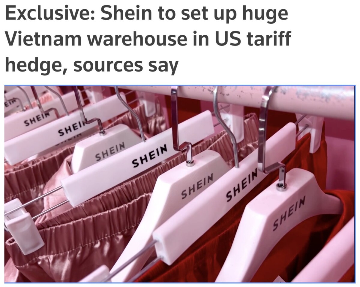 De Chinese fast fashion webshop Shein gaat een enorm magazijn huren in Vietnam, meldt persbureau Reuters op basis van twee anonieme bronnen. Shein zou uitwijken naar Vietnam in verband met de onvoorspelbare handelsspanningen tussen de Verenigde Staten en China en de bijkomstige invoerheffingen.