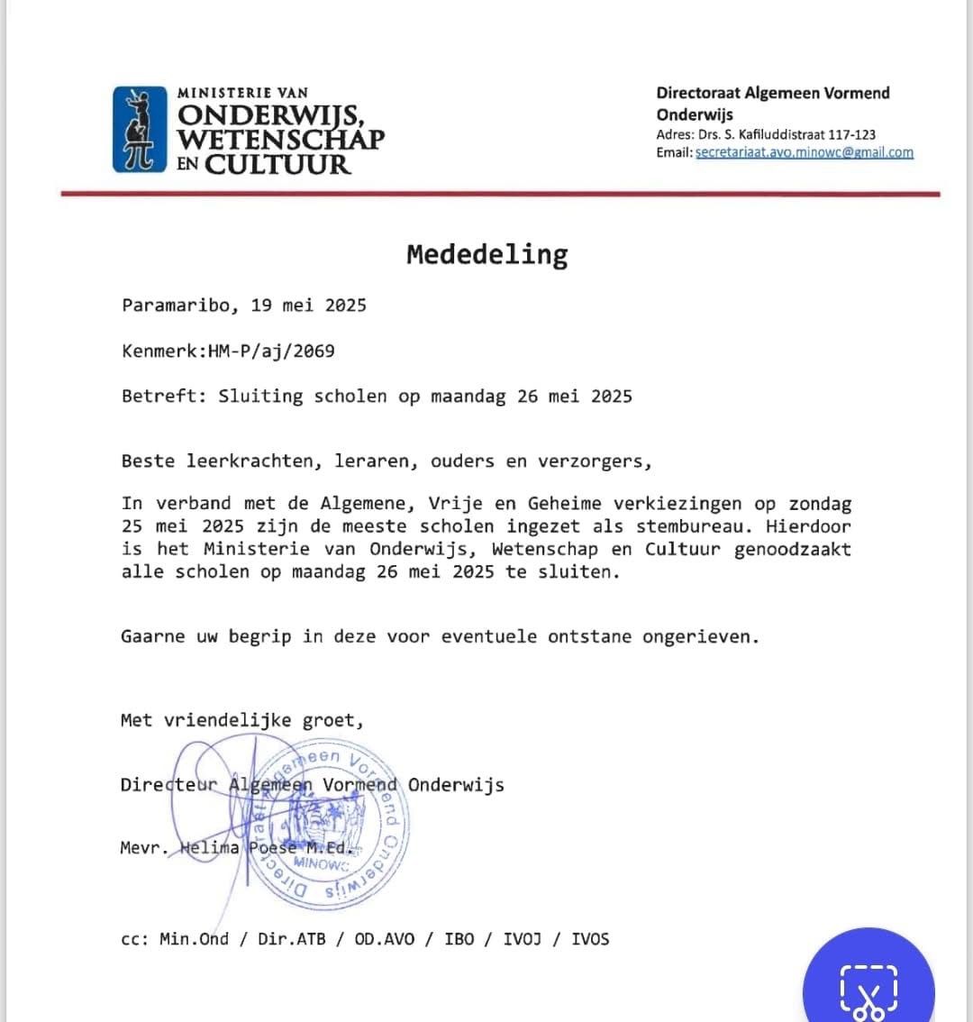 Het ministerie van Onderwijs, Wetenschap en Cultuur heeft besloten alle scholen op maandag 26 mei te sluiten.