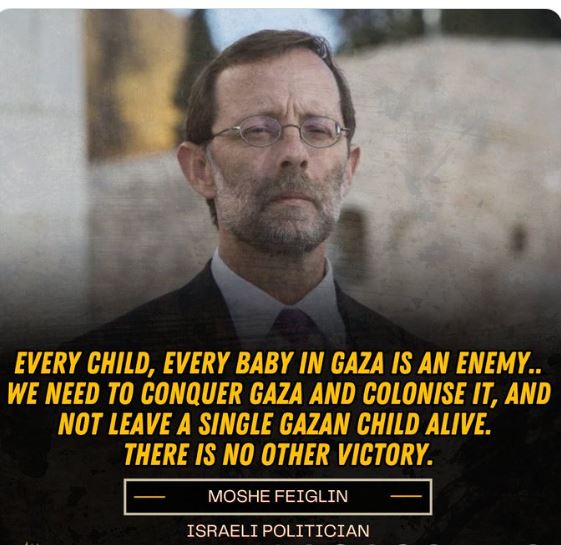 In een televisie-interview op een Israëlische zender deed Moshe Feiglin, voormalig Knessetlid en Israëlisch politicus, een uitspraak waarin hij verklaarde dat elk kind in Gaza een vijand is en dat voor een echte overwinning elk kind gedood moet worden.