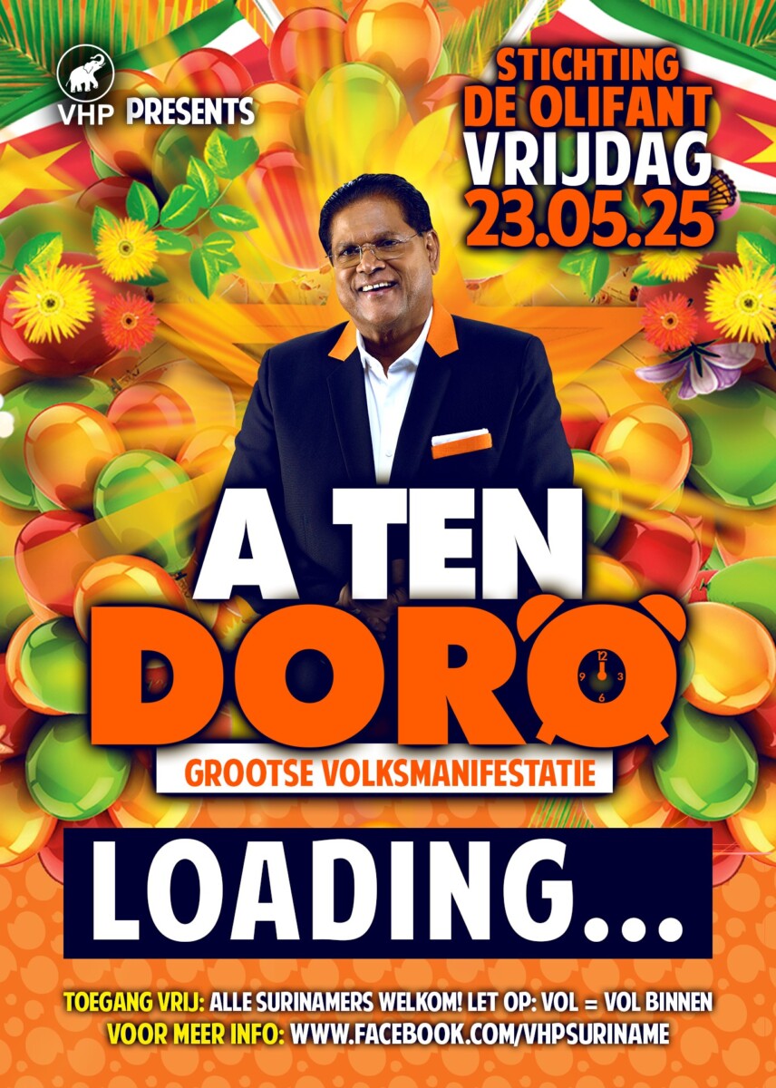 De Vooruitstrevende Hervormingspartij (VHP) organiseert een slot massameeting op vrijdag 23 mei bij Stichting De Olifant in Paramaribo.