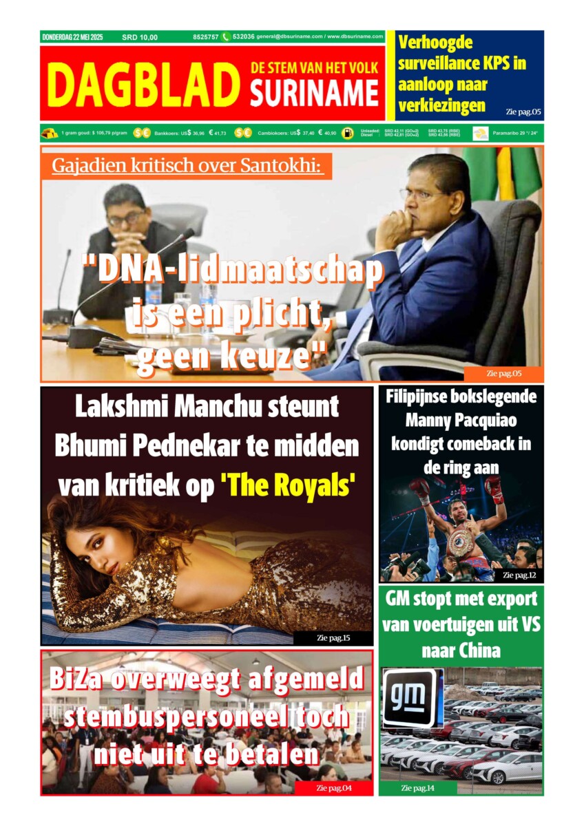 Dagblad Suriname, donderdag 22 mei 2025 Geplaatst op mei 22, 2025mei 21, 2025 Bericht navigatie VorigeVHP houdt slot massameeting op 23 meiVolgendePrijzen donderdag 22 mei 2025