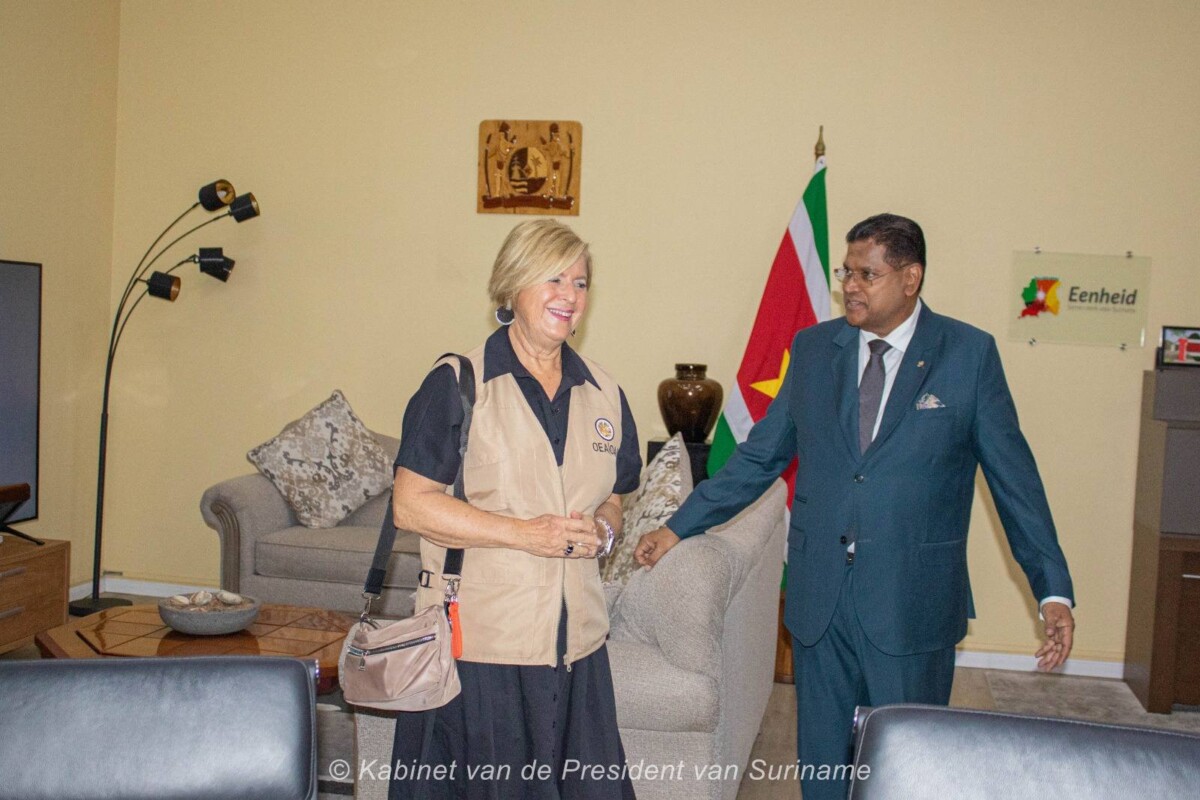 President Chandrikapersad Santokhi ontving donderdag 22 mei een delegatie van de Organisatie van Amerikaanse Staten (OAS), die in het land is om de komende verkiezingen te observeren.