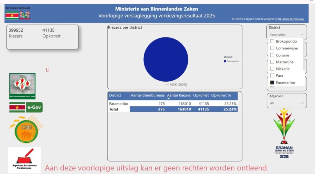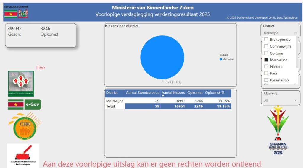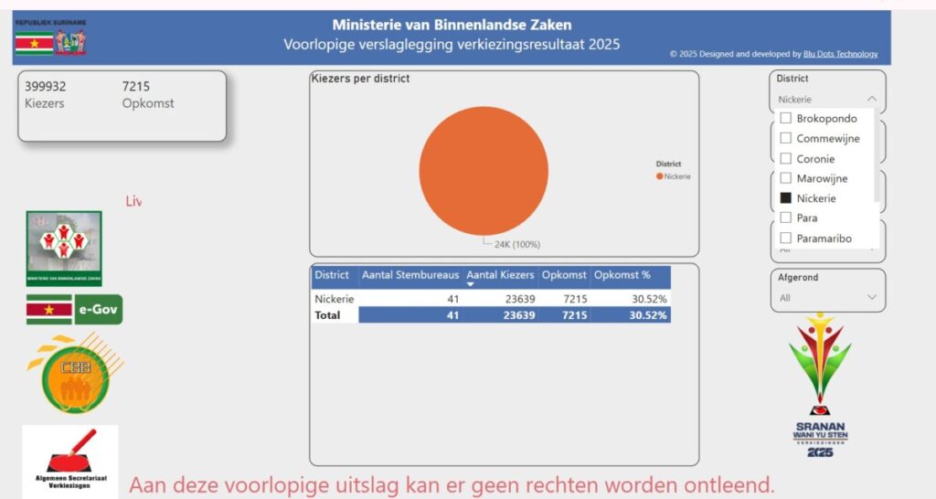 Volg de updates van de Nationale Verkiezingen 2025 Suriname op: https://app.powerbi.com/view?r=eyJrIjoiMWIxYzM5ZjgtODUyMC00NDA1LWFhNmEtYWFkNTA1NzgwNDUzIiwidCI6IjNmOGFhYzQ1LTU4N2MtNDgyZS04OTcwLTc3YTRjNDNkNDk4OCJ9