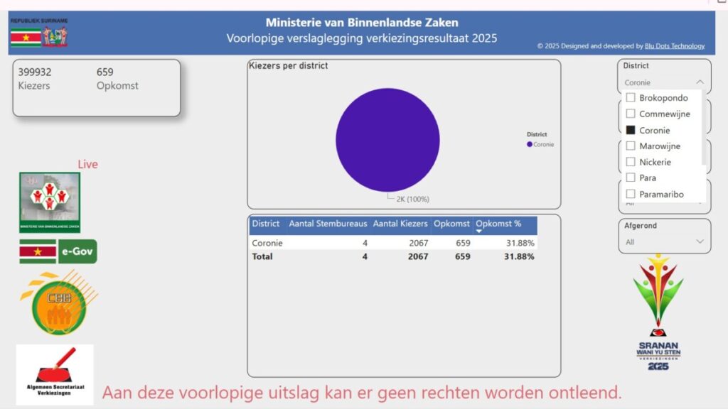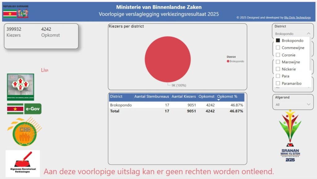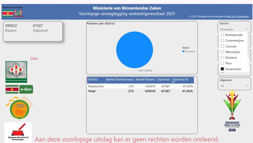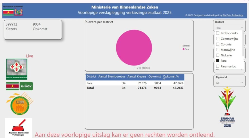Ruim 170.000 mensen hadden om vier uur hun stem uitgebracht Geplaatst op mei 25, 2025mei 25, 2025 Om 16.00 uur hebben 174.859 burgers gestemd = ππ,ππ% van 399.932 Paramaribo: 67.567 Brokopondo: 4.242 Coronie: 659 Para: 9.034 Voor updates over de verkiezingen ga naar: https://app.powerbi.com/view?fbclid=IwY2xjawKgTUZleHRuA2FlbQIxMABicmlkETE4MmtlTzA0Wjl6eFU3ZDdkAR4tHw9r3YPJzvEx3x1hfp0aLJhg0Tm6O76eF-DSv1dC2ymc1lFi3VGIrd_6fA_aem_9doy0yEiD6ULSegYblr4lQ Bericht navigatie VorigeVerkiezingsactiviteiten te Bernharddorp en OnverdachtVolgendeOpkomst bij verkiezingen 57.44% rond 18.00 uur